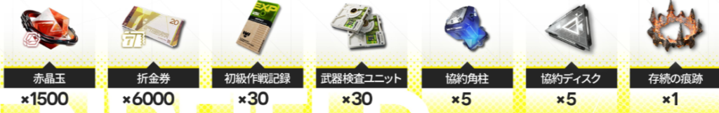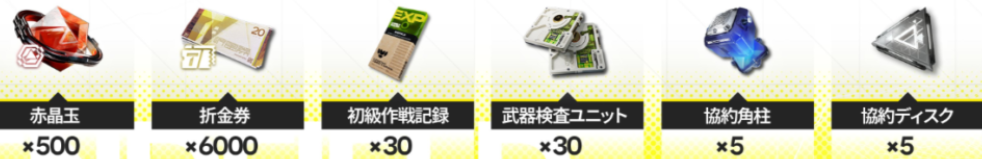 | RETURNOFALL (1/22リリース後~1/29 24:59まで) | ・赤晶玉×500 ・折金券×6,000 ・初級作戦記録×30 ・武器検査ユニット×30 ・協約角柱×5 ・協約ディスク×5 ![]() |